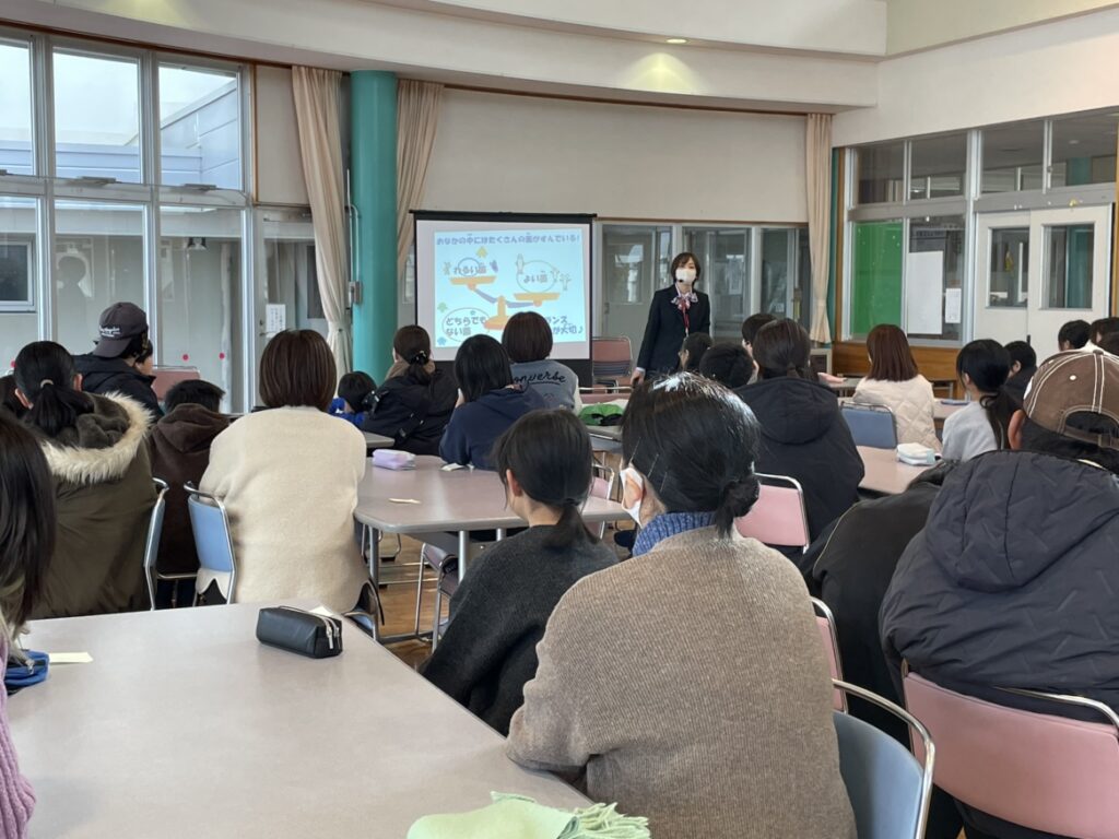 生活習慣のポイントを紹介する場面では、親子で顔を見合わせながら日頃の生活を確認する様子が見られ、家庭でも健康について話し合うきっかけとなったようでした。