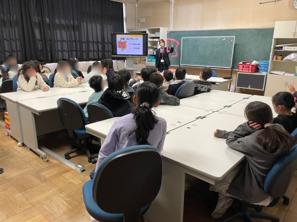 授業のはじめに「ヤクルトが好きな人?」と問いかけると、子どもたちは大きな声で元気よく手を挙げてくれました。授業では、消化器官のはたらきやおなかの中に住んでいる菌についてお話しし、「おなか元気生活」のポイントとして、「早寝・早起き・朝ごはん・朝うんち」の大切さをお伝えしました。