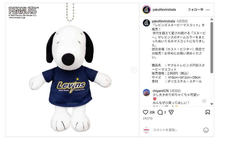 「レビンズスヌーピーマスコット」販売を発見しました!世代を超えて愛される「スヌーピー」がレビンズのチームカラーをまとったぬいぐるみです。