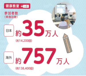 また、大人向けには、各地域の販売会社の従事者等が講師となり、センターや公共施設等を利用して、腸の大切さやプロバイオティクス、季節に流行する疾患等、幅広いテーマで「健康教室」を開催しています。日本では約35万人、海外でも約757万人にご参加いただいており、世界各地で年間15万回以上実施しております。